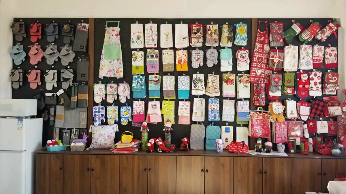 Produk utama: Handuk dapur, sarung tangan oven, celemek, pemegang panci, taplak meja